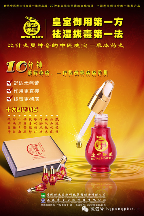 绿光国际“草本排毒药灸疗法”是利用针灸和热灸的原理,将名贵中草药配伍而成。草本抑菌排毒粉加蛋清或黄酒或米醋或牛奶,任选一种即可,调成膜状后在穴位和痛点贴敷,不需要点燃,药物自行发热,5分钟扩张毛细血管,加速血液循环(有温热感);10分钟药力渗透皮下组织(有灼热感),15分钟疏通经络、消除疼痛(有针刺感);20分钟排出身体湿毒(有黄色水珠形成)。完全替代了传统针灸、刮痧、拔罐、火灸、口服药物等疗法,所灸部位药力作用持续72小时以上,让人舒适、轻松、自在。